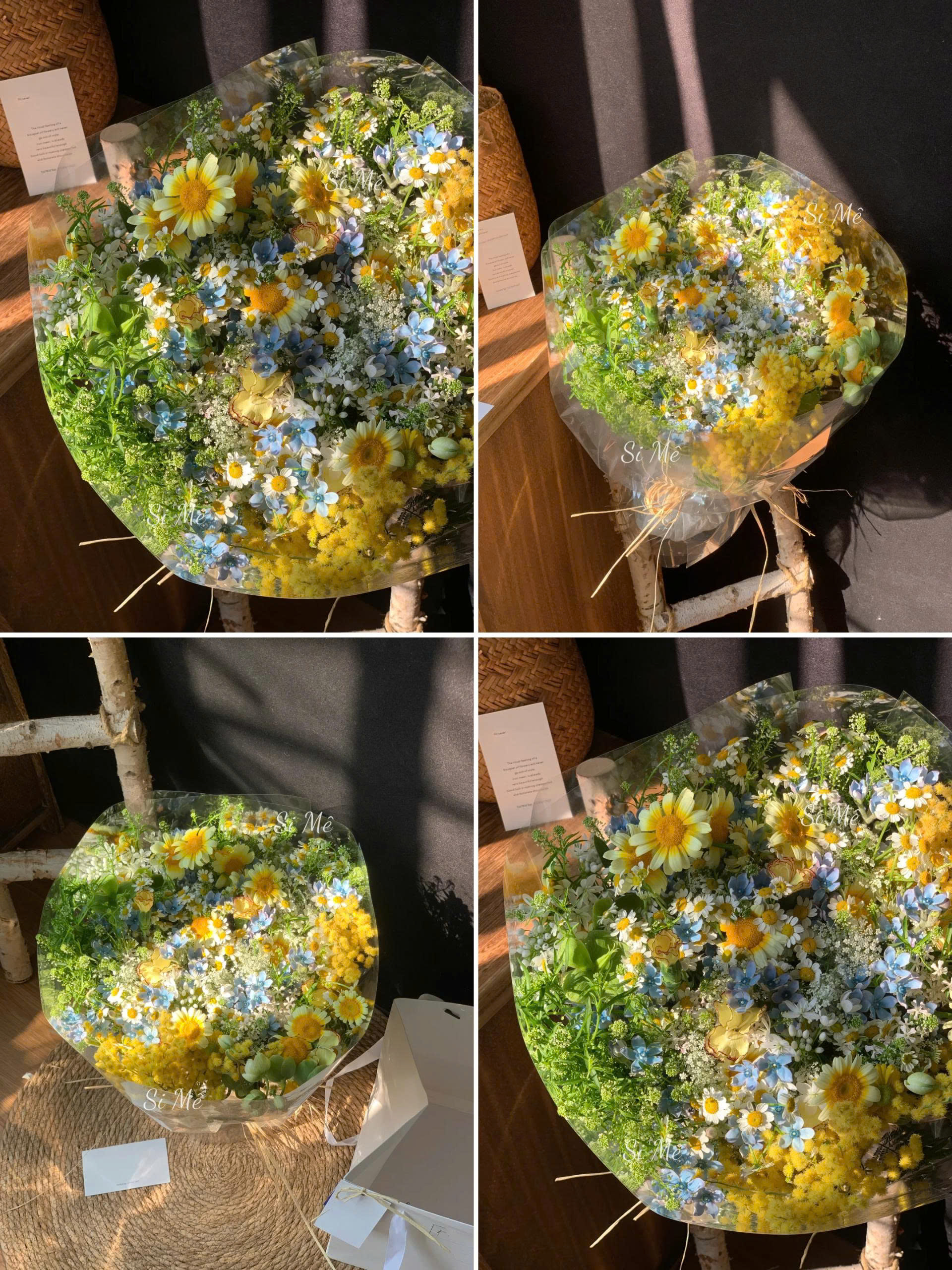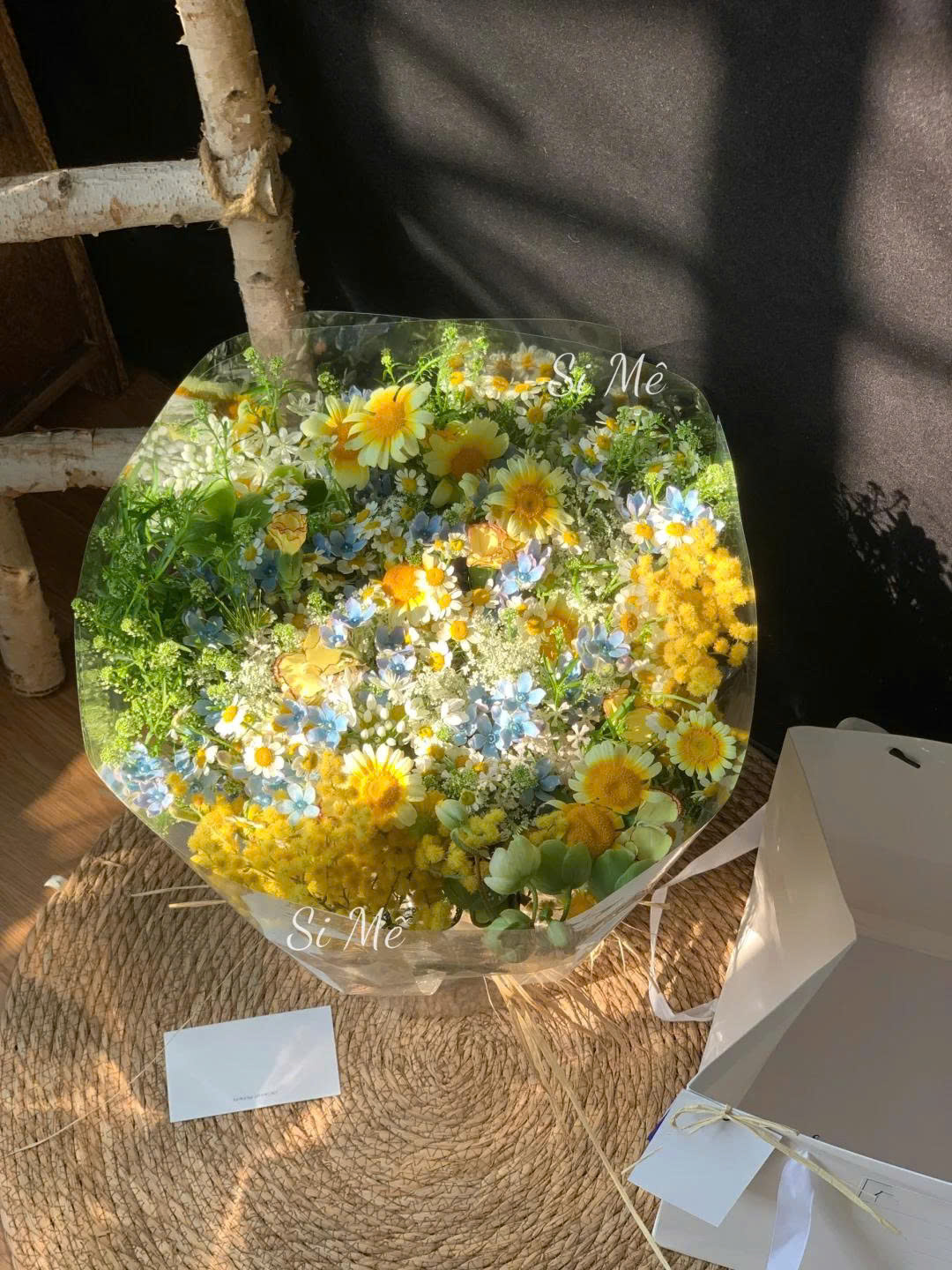 Bó hoa rực rỡ phối đồng tiền, cúc họa mi, hoa sao xanh và mimosa vàng – như khu vườn mùa xuân trong tay, mang đến năng lượng tích cực và bình yên.