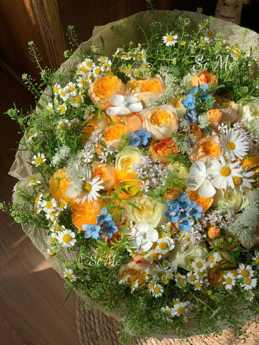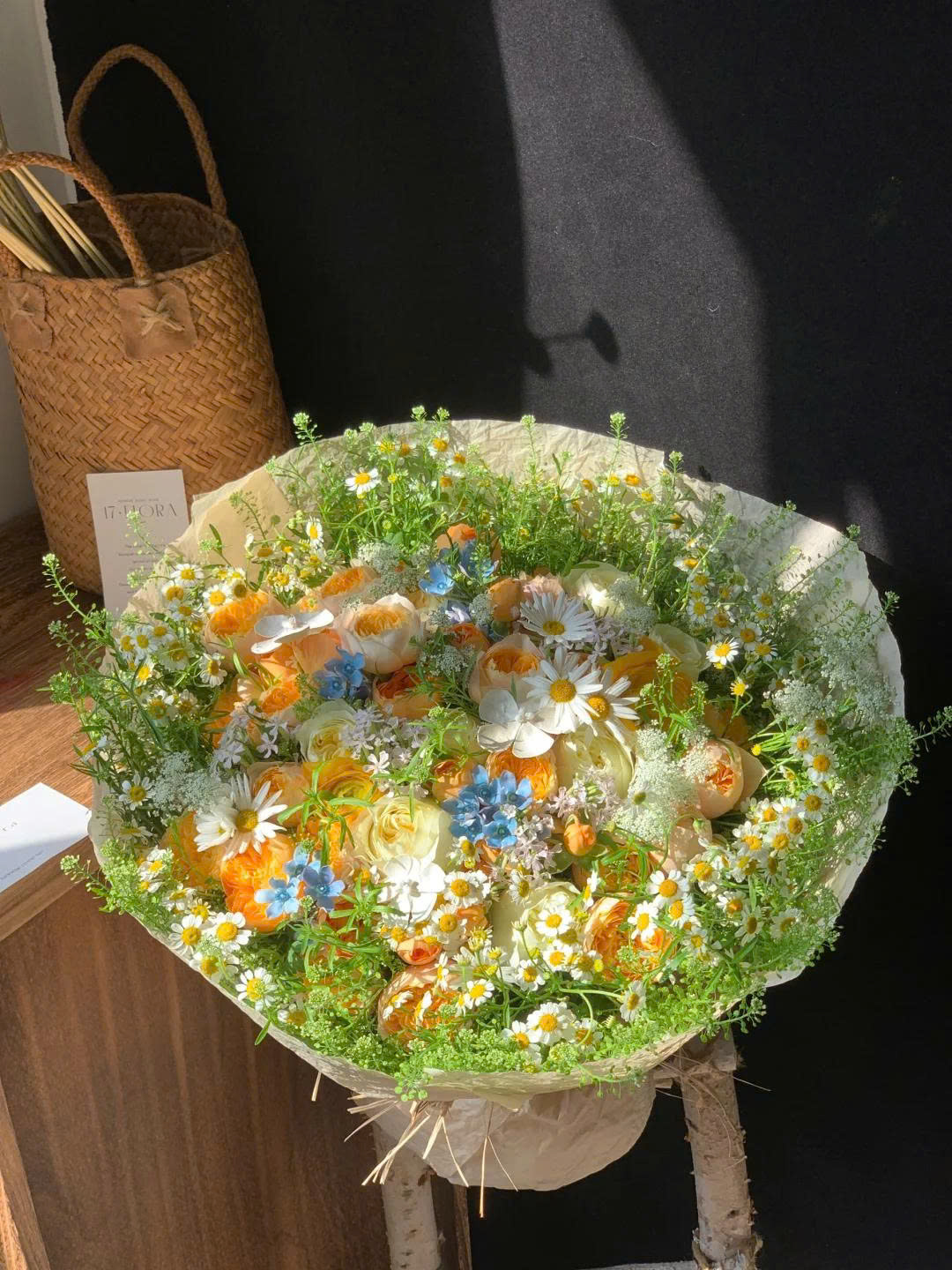 Bó hoa đa sắc phối từ hoa hồng Juliet, cúc tana, lưu ly xanh – đầy chất thơ, cá tính và nghệ thuật – dành riêng cho tâm hồn không giới hạn.