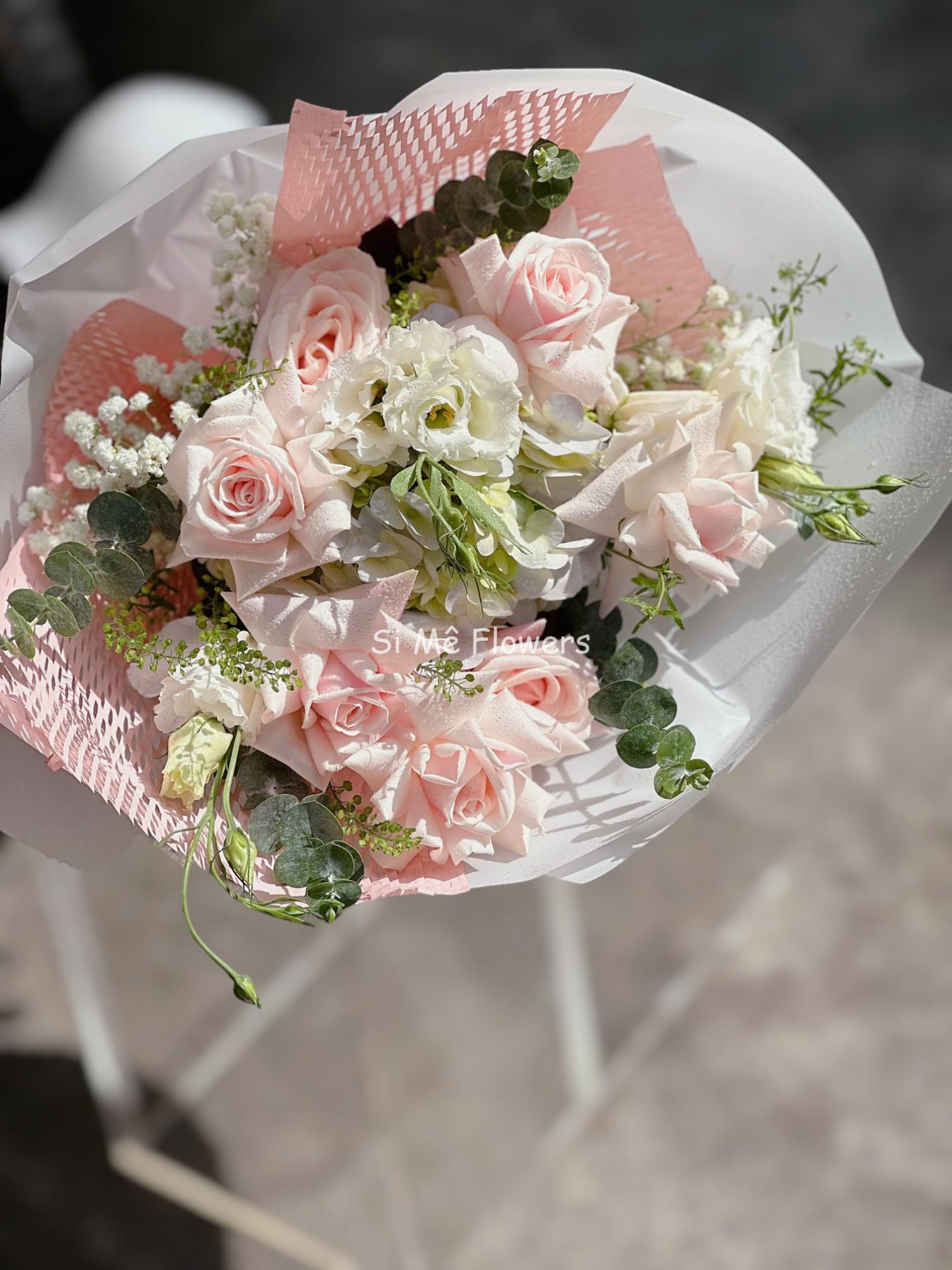 Review Bó Hoa Nho Mẫu Đơn Mix Hoa Hồng Trắng & Lá Bạc – Sang Trọng & Đẳng Cấp