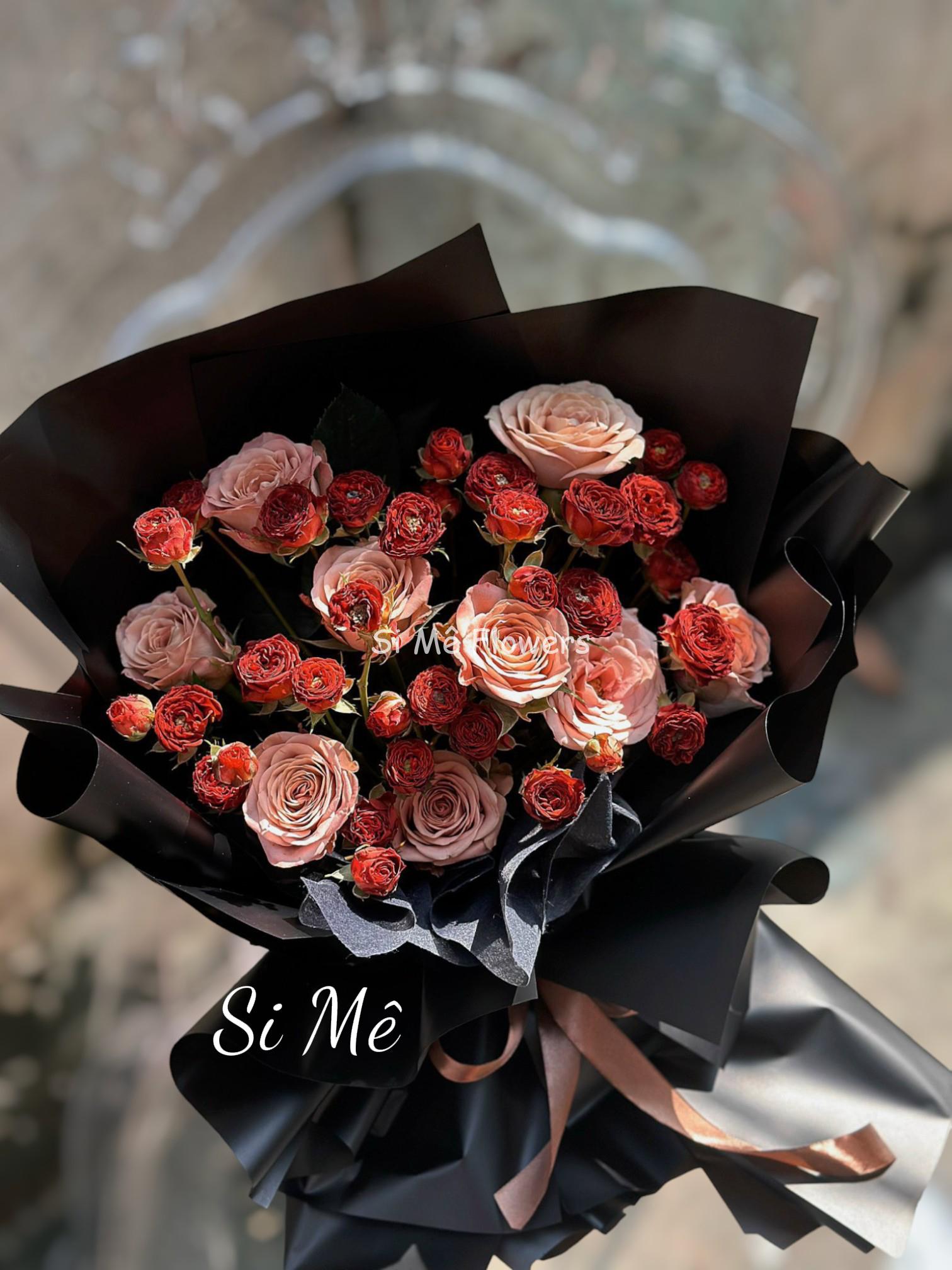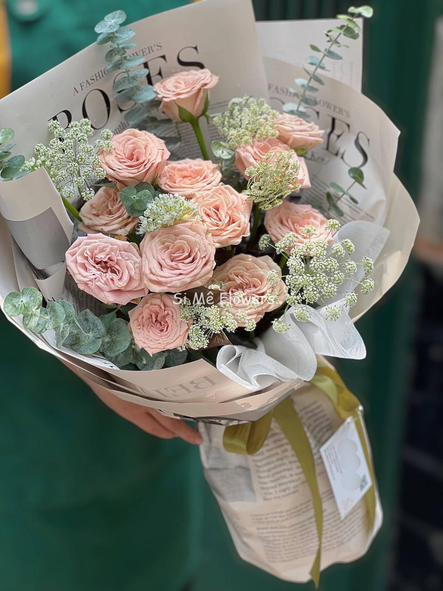 Bó hoa nho mẫu đơn nhập khẩu hơn 1kg mix hoa cúc tana & lá bạc – sang trọng, tinh tế, vừa đẹp mắt vừa thưởng thức được.