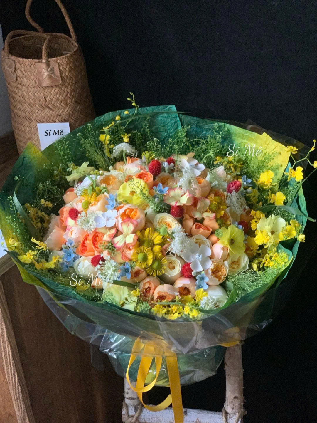 Bó hoa vàng cam pastel phối đỏ xanh – kết hợp tinh tế giữa hồng cam đào, cúc họa mi, baby xanh, tạo nên món quà rực rỡ, trẻ trung nhưng vẫn đầy cảm xúc sâu lắng. Giấy gói xanh rêu phối vàng sang trọng.